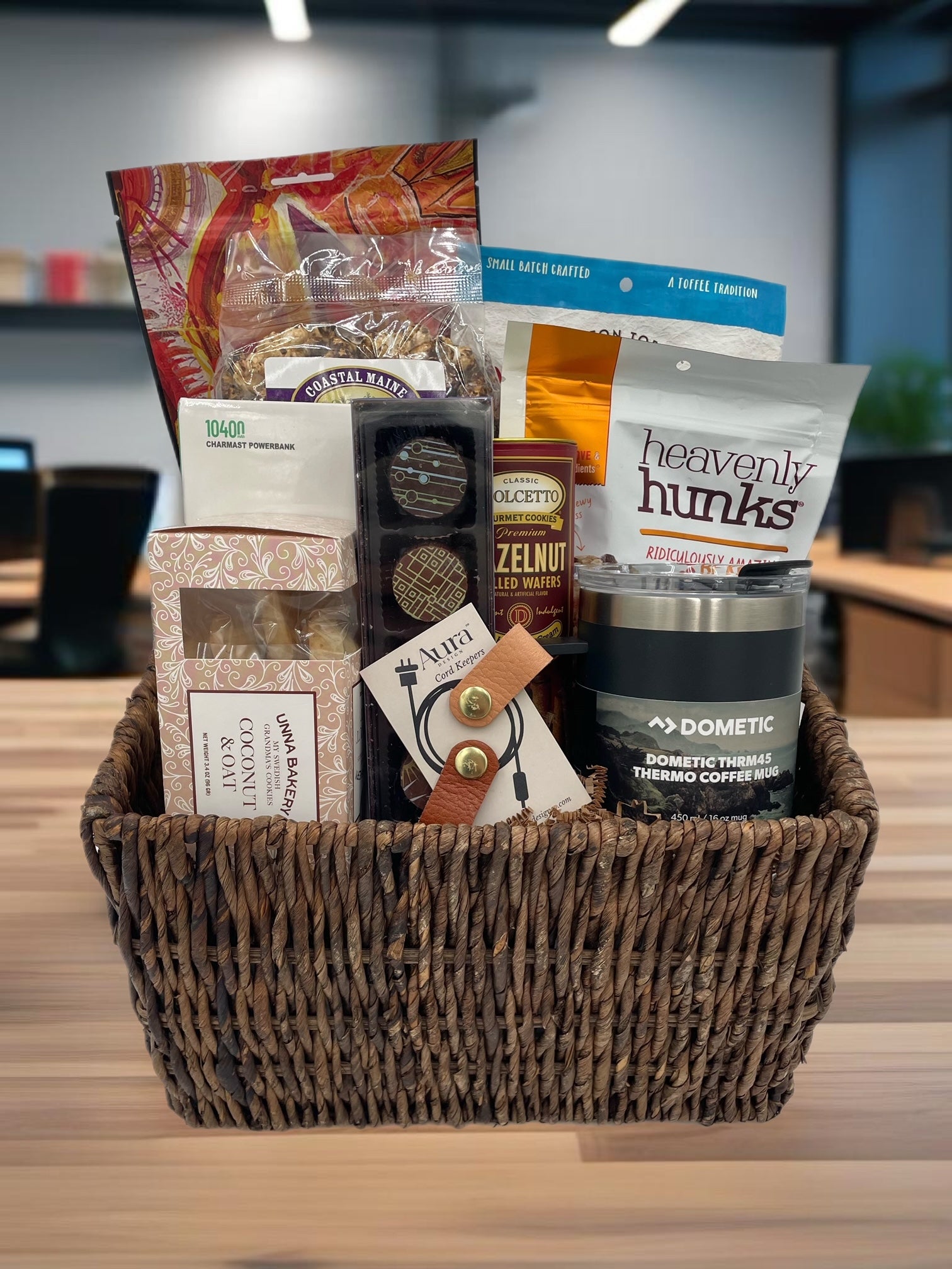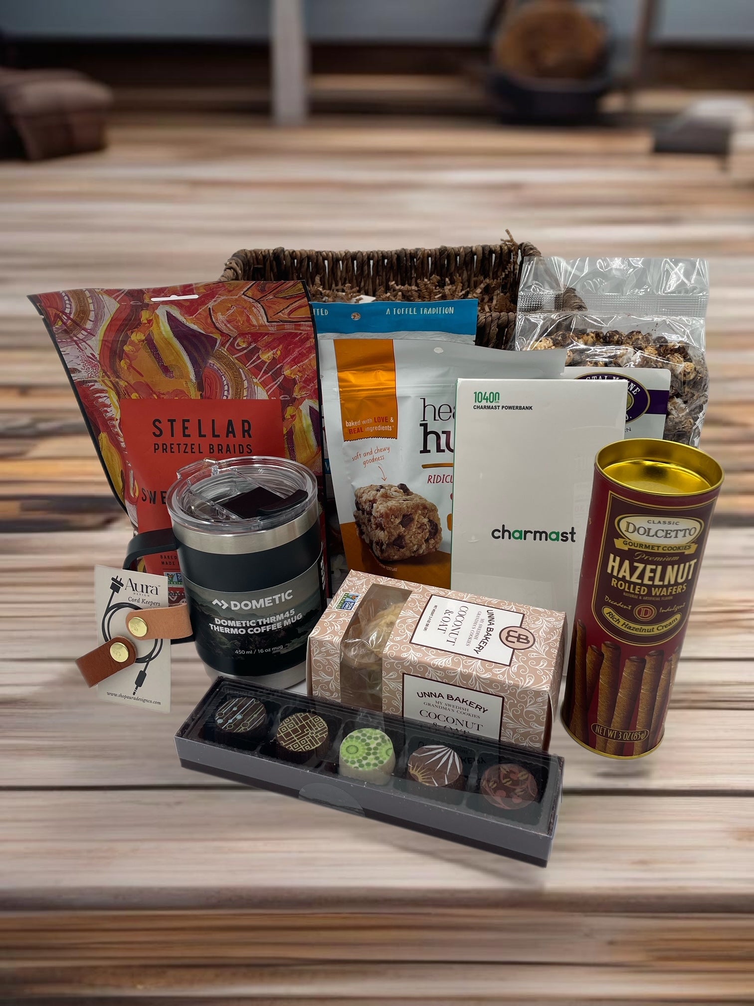 Elevate your snacking and tech experience with our Ultimate Snack & Tech Gift Basket, a thoughtfully curated collection designed for both indulgence and convenience. This stylish set is beautifully presented in a rustic banana bark crate, blending functionality with charm. Inside, you'll find a thermal coffee mug to keep your beverages warm, a portable electronics charging station for on-the-go convenience, and a selection of delicious treats to satisfy any craving. Indulge in butter toffee pretzels, Stellar pretzels, and popcorn by Coastal Maine. Enjoy the luxurious taste of hazelnut rolled wafers, bakery cookies by Unna, and a 5-piece assortment of chocolate truffles. Additionally, keep your tech organized with leather electronic cord snaps.